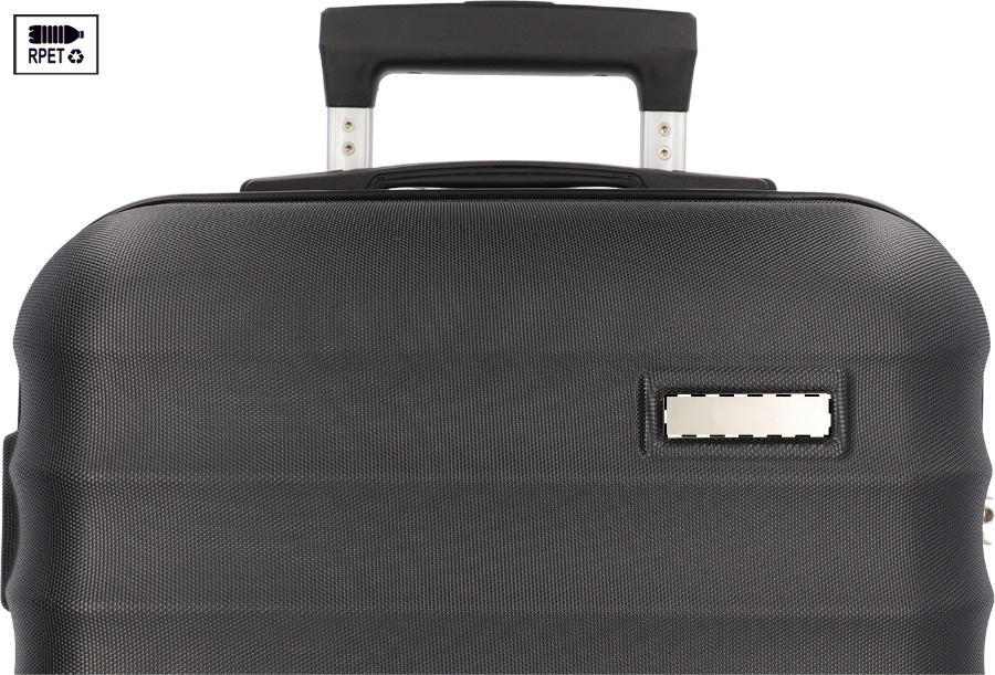 20 Zoll Hartschalen-Trolley aus RPET mit 4 Rollen, Teleskopgriff und Zahlenschloss. Mit RPET-Innenfutter und elastischen Befestigungsgurten. Mit Metallplatte für Logogravur