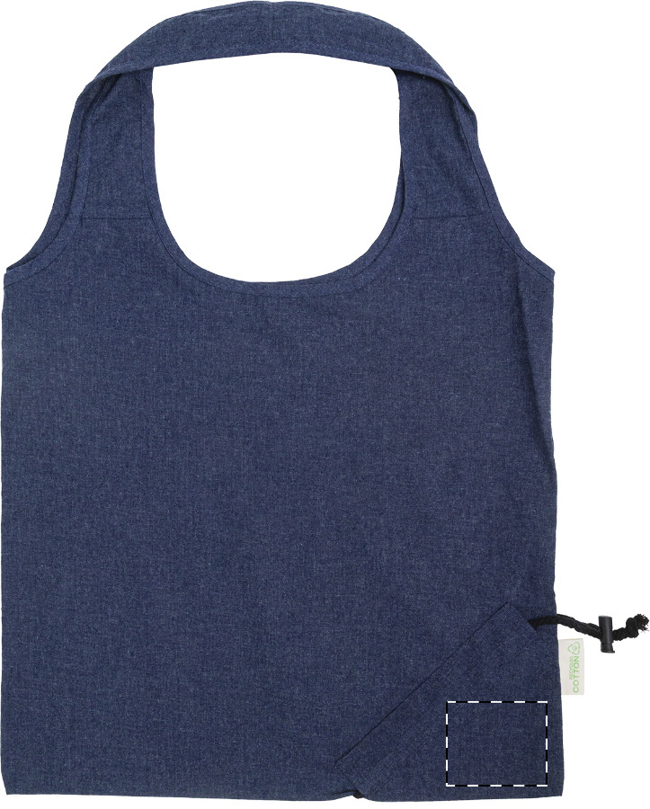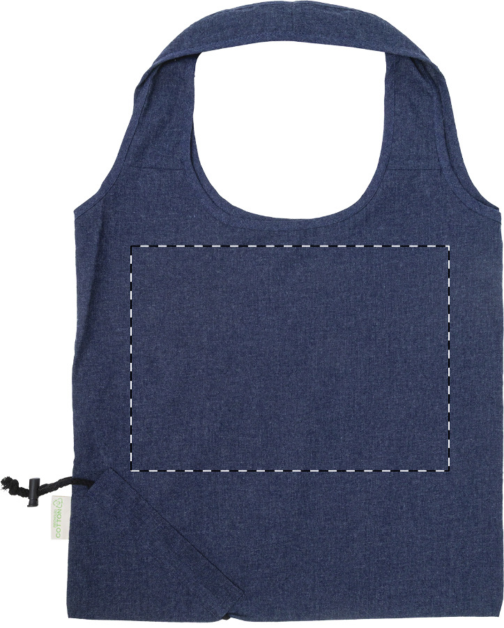 Faltbare Einkaufstasche aus 70 % recycelter Baumwolle und 30 % RPET-Polyester, 140 g/m². Mit Label recycelte Baumwolle.