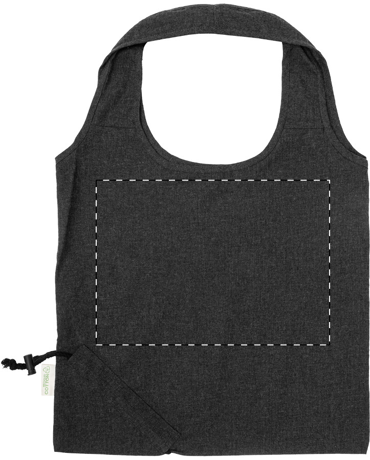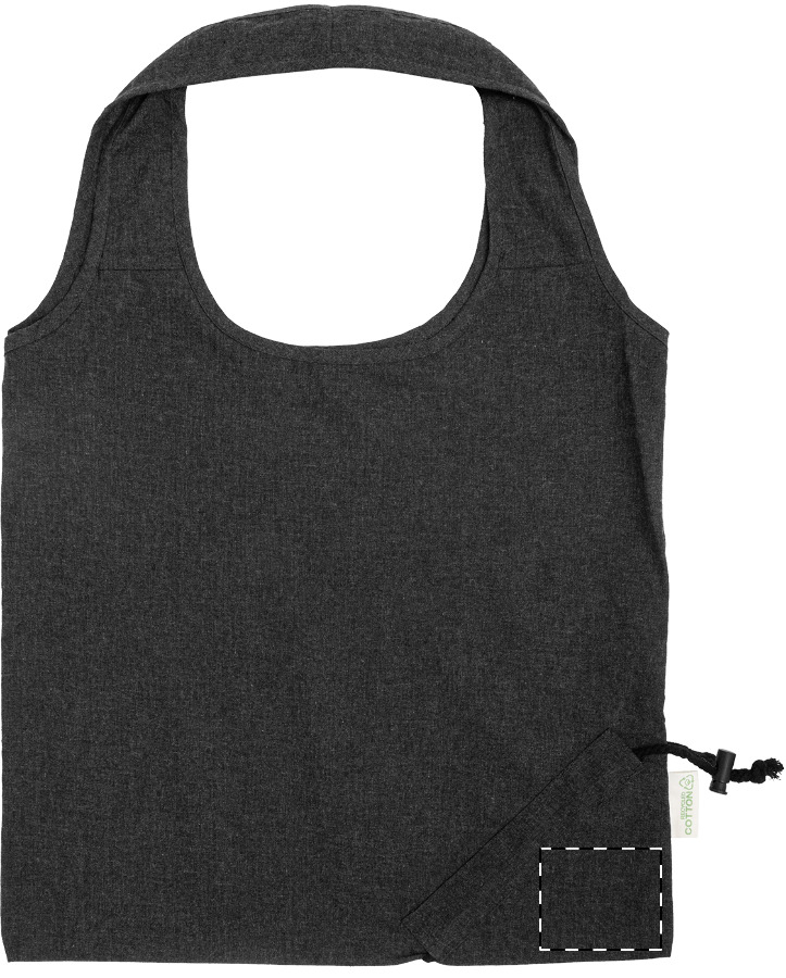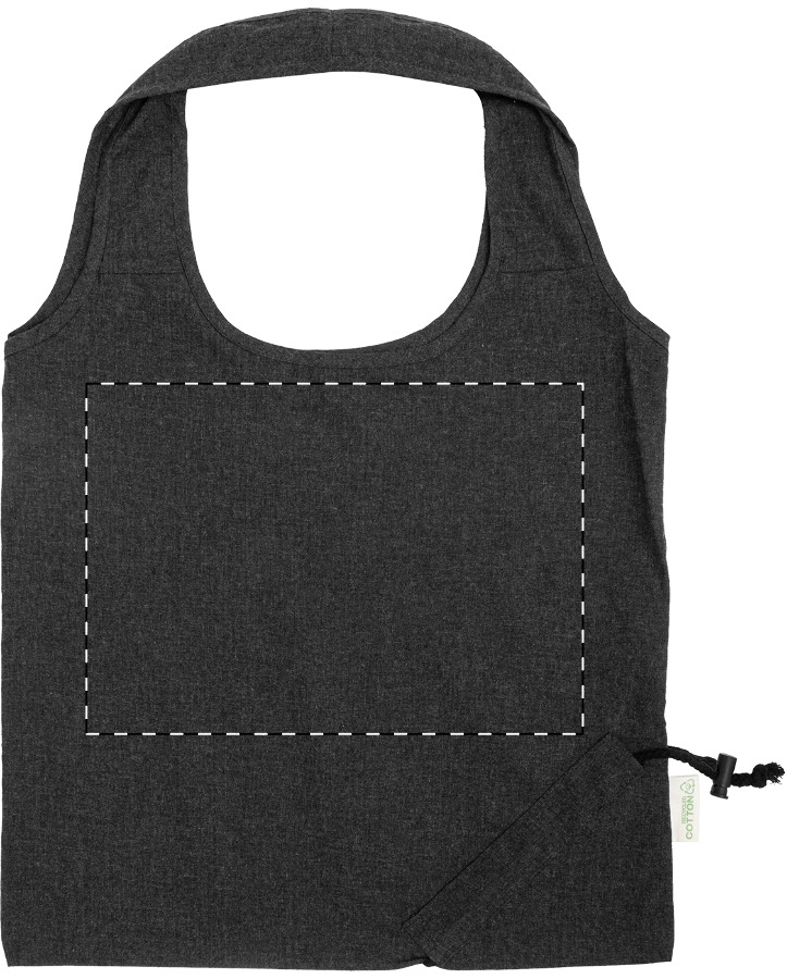 Faltbare Einkaufstasche aus 70 % recycelter Baumwolle und 30 % RPET-Polyester, 140 g/m². Mit Label recycelte Baumwolle.